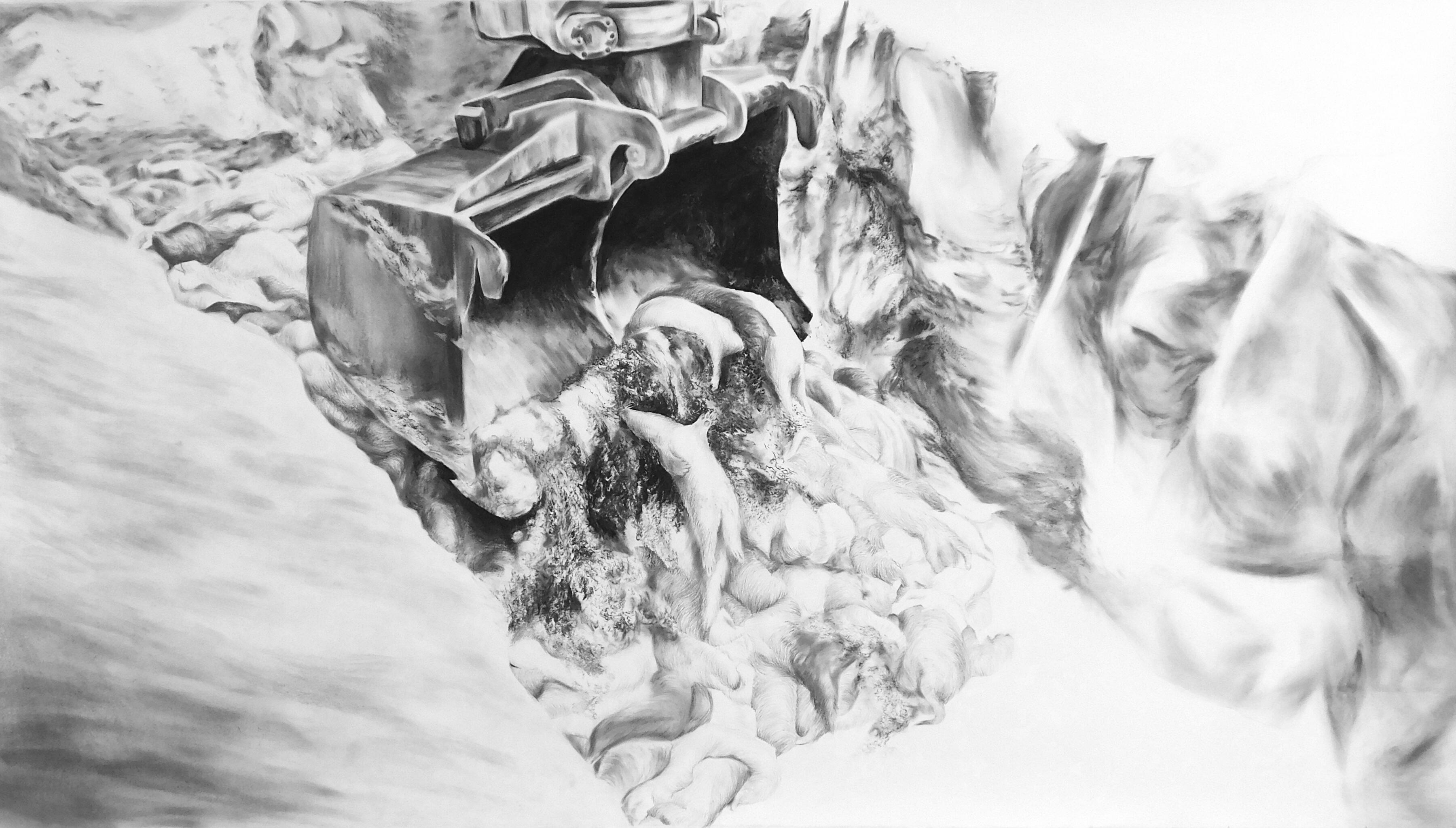 Mitrović takes these images and translates them into charcoal on paper and oil on canvas, dimensions of which at times exceeding two meters. While the digital is lost in a stream of content, the work demands confrontation. That difference in labor is a difference in attention, which is a difference in ethics.The charcoal works are the backbone of the project as they operate in a visual register that refuses resolution. Burial of Mink in a Mass Grave in Denmark, 2020. does not clarify its source. One sees shapes that could be machinery, could be earth, or bodies, and thousands of bodies, in fact, bulldozed into trenches on military land near Holstebro. The Danish government had ordered the killing of all seventeen million farmed mink in the country after SARS-CoV-2 mutated within the densely packed populations and jumped back to humans, made possible by the conditions of industrial farming: small cages, high densities, immunocompromised animals. When the hastily buried carcasses began pushing back up through the soil weeks later (an event the global press called "zombie mink"), the architecture of concealment had failed, causing an outrage. Contamination holds the viewer within the soil, moments before that failure. The image hovers between abstraction and documentation. You know what you are looking at, yet you cannot entirely see it? This gap between knowing and seeing is where the work lives. In that sense, this project is less epistemological and more ethical. Mitrović is not asking what can we know through images? but what do we already know and choose not to look at? This is art as combatant—even militant—counter-architecture: an instrument built to make visible what another structure was built to hide.