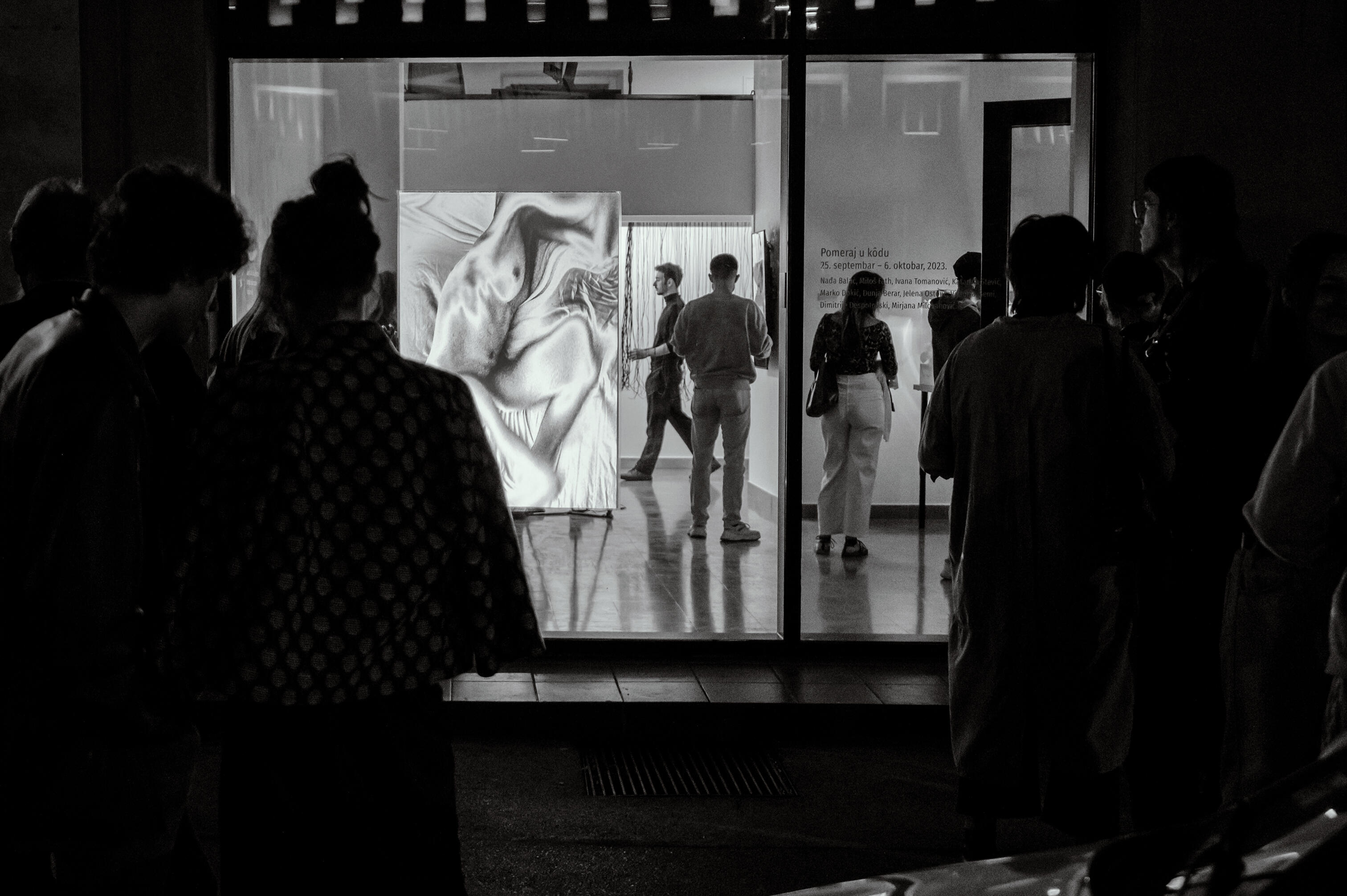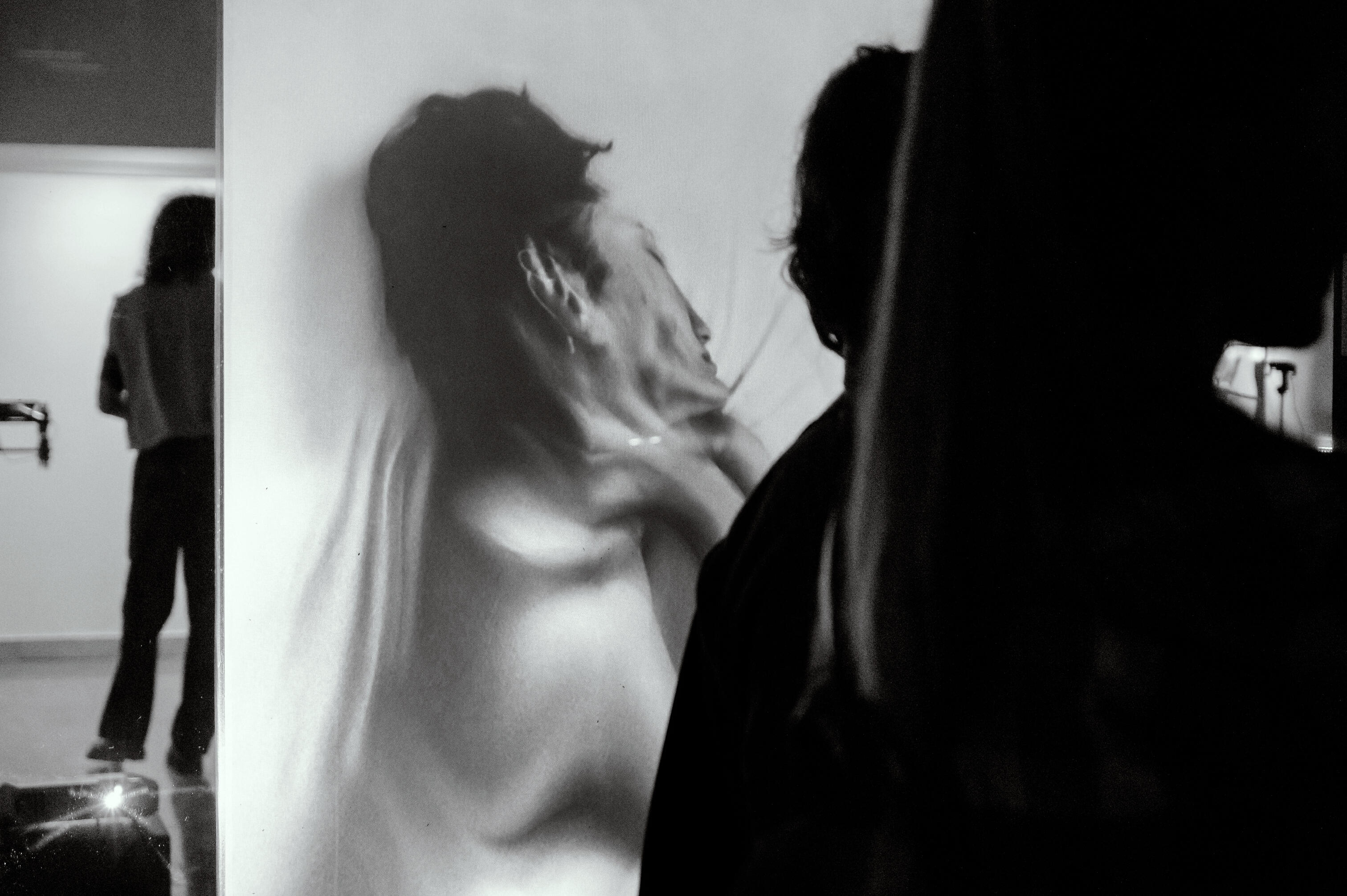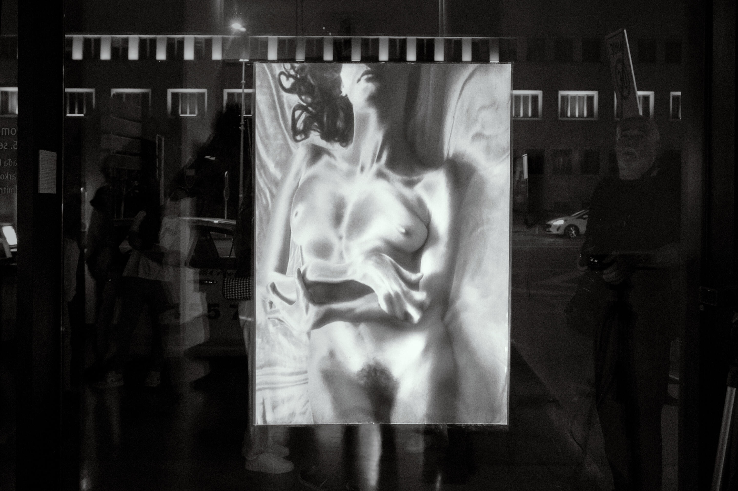 Thirty solarized analogue photographs of a female nude projected onto a gallery window as a sensor tracks the movement of passersby. Each body that crosses the frame triggers a manipulation: the nude bends, distorts, fractures as her skin stops fitting right.This is a work about the body becoming foreign territory, the particular violence of being seen—how the external gaze enters and rearranges what it finds. The installation operates between midnight and dawn: the hours when perception loosens, when the distance between self, reflection and projection stretches thin. The public, walking past, may not know they are participants. They do not need to, as the work functions the way scrutiny does: without consent.The solarized image—a photographic process that inverts and destabilizes—mirrors a body caught between presence and dissolution. Analogue, the grain is visible. The body remains a body, even as it warps. The window is both screen and membrane, between two spaces. The nude exists in the threshold.