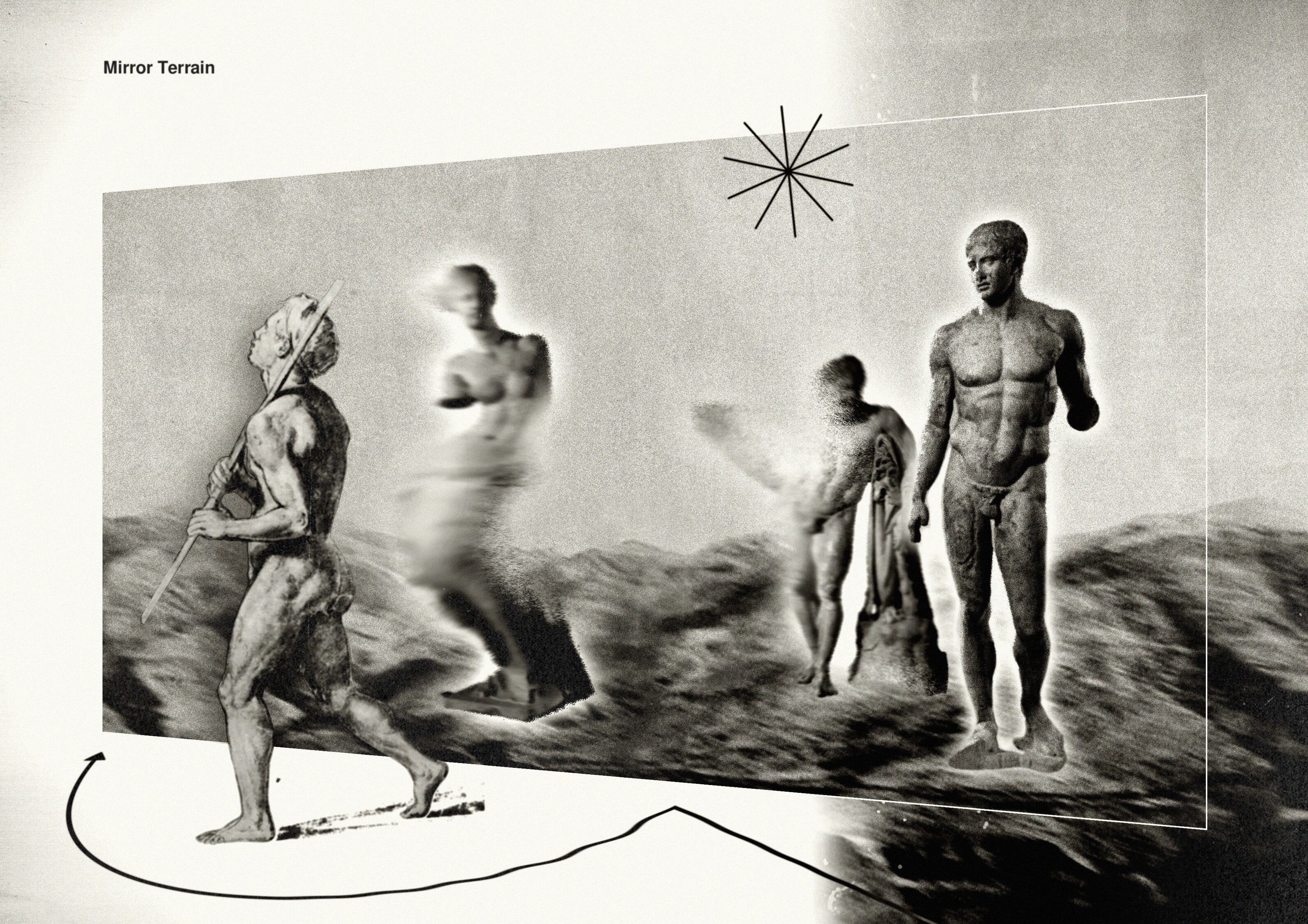 These notions inform Mirror Terrain, an installation within which: images of ancestors, the significant dead, archetypal figures and even past audience. A viewer's reflection enters the three-dimensional space and moves among them. Contact erodes these figures as the they offer no resistance.The eye can be trained to see what is absent. Memory, made tangible, becomes something to navigate, to damage or protect. The work asks what preservation requires: not only remembrance, but attention beyond the present. The act of turning toward what is absent cultivates resilience as the random compositions of figures reveal scenes of families, communities and relationships in a shared, absolute flow.