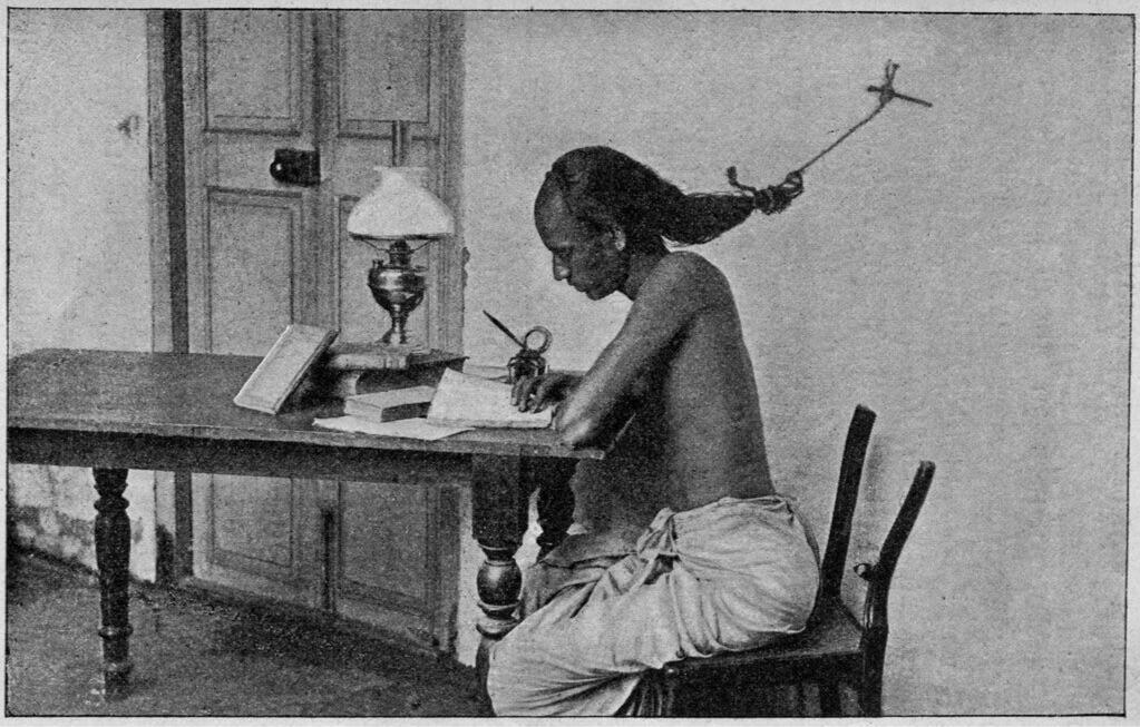 University of Madras student ties his hair to nail to prevent sleeping at night while preparing for exams, 1905. 1