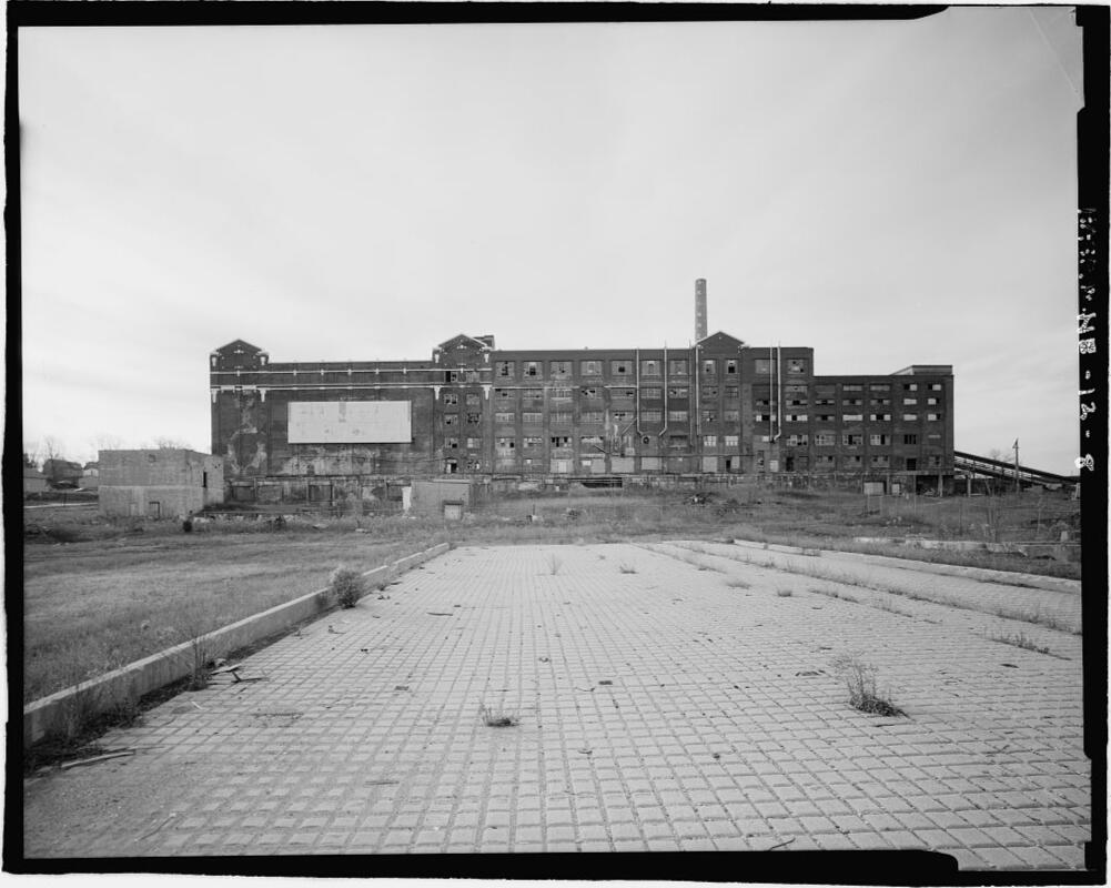 Skinner Meat Packing Plant, 6006 South Twenty-seventh Street, Omaha, Douglas County, NE1, View of main building looking south (concrete in foreground is part of holding pens), Library of Congress Prints and Photographs Division Washington, D.C. 20540 USA