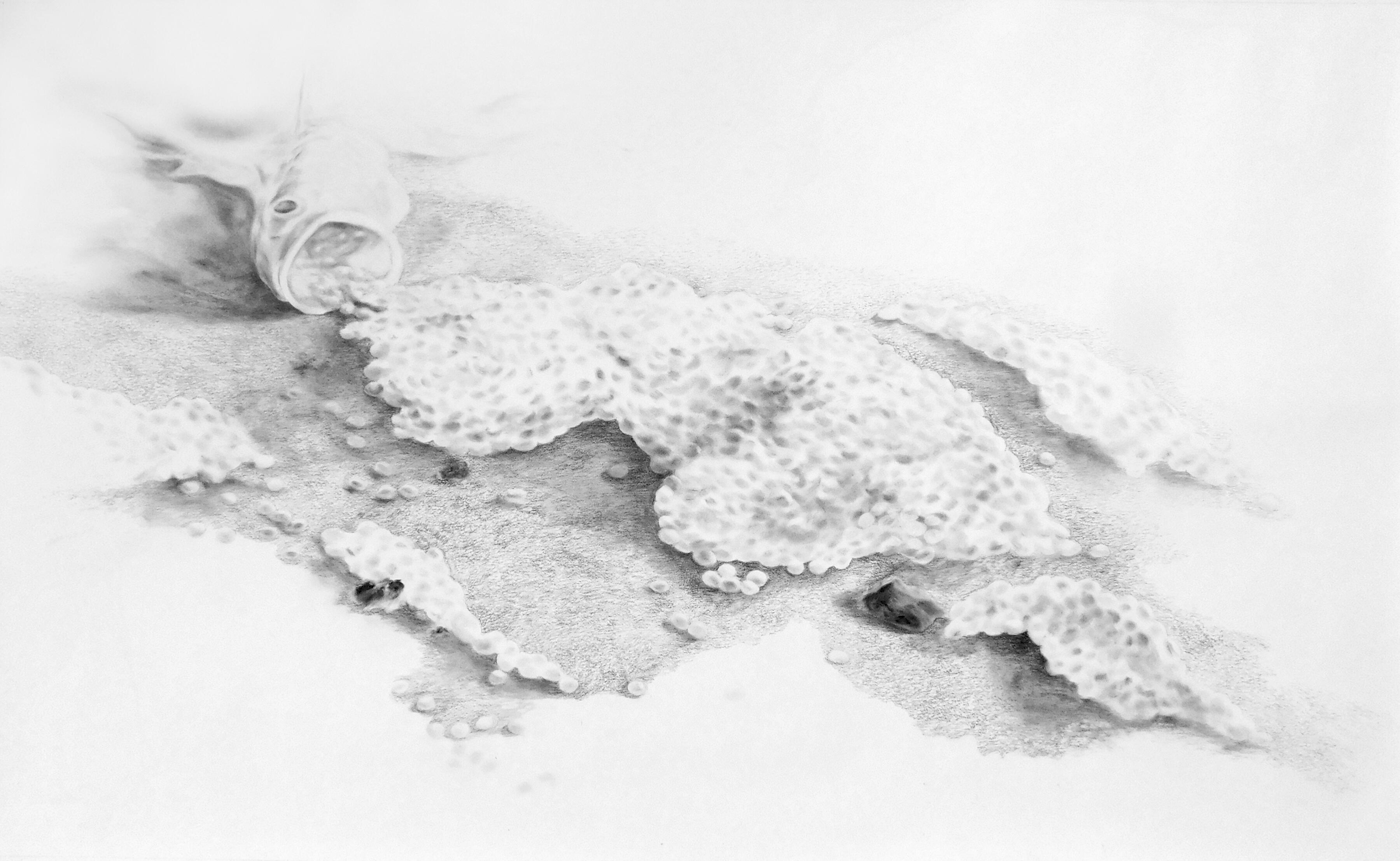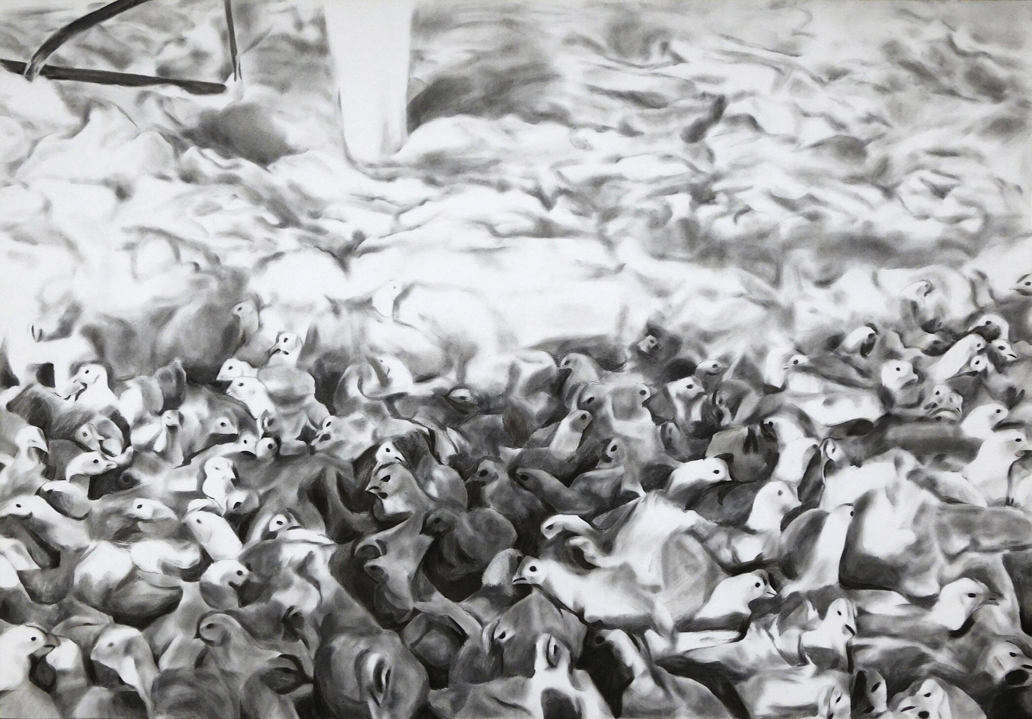 The structural titles do essential work. Without them, the charcoal drawings could be absorbed as atmospheric abstraction, or anything else that’s safely vague. They specify dates, places, industrial processes and institutional failures. They restore what Carol J. Adams calls the absent referent, the living animal that disappears behind the euphemisms of commodity language. Adams describes a three-step process by which animals vanish: objectification, fragmentation, and finally—consumption. Language finishes the job: “beef“ not “cow“, “pork“ not “pig“. Contamination’s titles reverse this process and reassemble the referent, which creates a productive tension at the heart of the work as the viewer is unable to retreat into pure form and dismiss the subject matter. In Regarding the Pain of Others, Sontag argued that images of suffering serve as an invitation to pay attention, to reflect and to examine the rationalizations for mass suffering offered by established powers, but she also warned that compassion is unstable as it needs to be translated into action, lest it withers4. The tension in Contamination is precisely this: the work creates the conditions for attention but refuses to resolve the question of what shall be done with it.